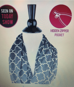 - Super soft, lightweight infinity scarf with quatrefoil pattern design, Jersey cotton soft. The best part? It has a hidden zipper pocket for your phone, wallet, passport, money, keys, ID or credit cards!