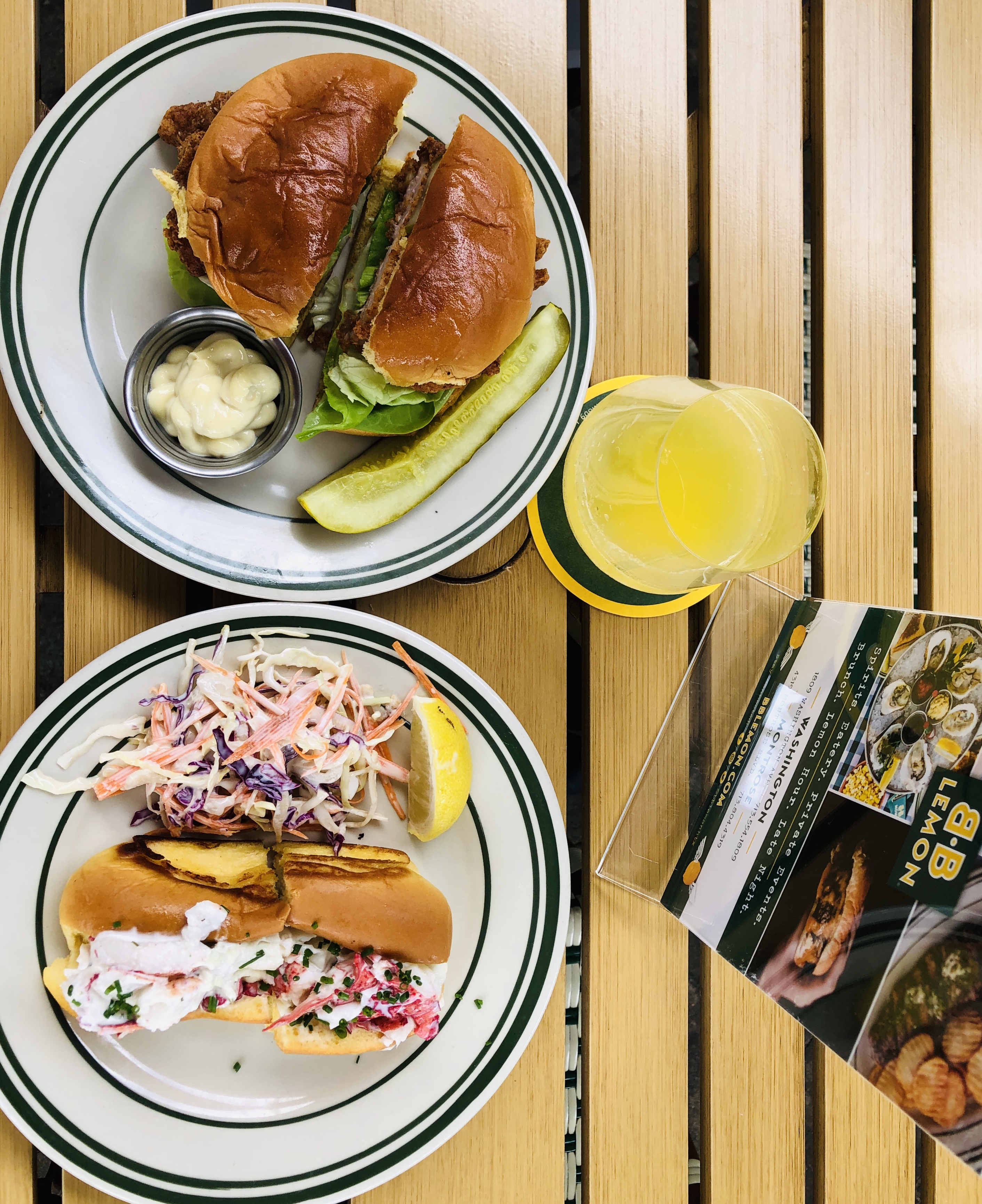 BB Lemon offers several wine options by the glass or bottle. But we’re mimosa girls, so that’s what we had. You can get mimosas for $6 each or a carafe with three juice flavors for $24.